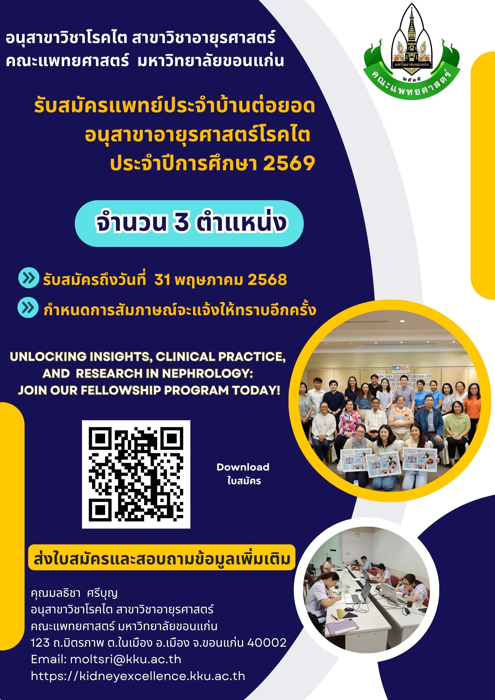 Apr 19, 2024 ข่าว รับสมัครแพทย์ประจำบ้านต่อยอด อนุสาขาอายุรศาสตร์โรคไต ประจำปีการศึกษา 2569 Attachments เกณฑ์การรับสมัคร.pdf (172.557 kibibytes) ใบสมัคร KKU Nephro Fellow ปีการศึกษา 2569.docx (29.504 kibibytes)